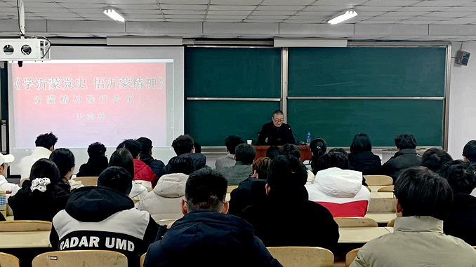 尹志林以《学沂蒙党史•悟沂蒙精神》为题,用一个个鲜活的英烈事迹、一幅幅珍贵的历史照片、一段段亲临现场的视频,以真情实景将沂蒙精神的发展、形成过程娓娓道来。他的讲述如同一幅徐徐展开的壮丽画卷,将那段峥嵘岁月中的血与火、情与义生动地呈现在听众眼前。那些镌刻在历史丰碑上的名字——革命先驱孙金宣、刘晓浦刘一梦叔侄、孙善师孙善帅兄弟、传奇抗日英雄邢祚光、爆破大王臧西山、神枪手金维三、红嫂明德英、沂蒙六姐妹……仿佛穿越时空,在铿锵有力的叙述中重获新生。泛黄的照片里,补丁摞补丁的军装诉说着艰苦卓绝的岁月;高清影像中,巍峨的孟良崮纪念碑犹如一把刺破苍穹的利剑,见证着军民鱼水情的永恒。当大屏幕上播放支前群众推着独轮车穿越炮火封锁线的画面时,车轮碾过碎石的声音仿佛就回荡在教室的每个角落,让在场大学生们不自觉地屏住了呼吸。这种沉浸式的讲述方式,恰似一场精神的春雨,润物无声地滋养着年轻的心灵,使“党群同心、军民情深、水乳交融、生死与共”的深刻内涵,从抽象的十六个字化作可触可感的生命温度。在声光电交织的现代叙事中,历史的火炬正以最鲜活的方式传递给新时代的接力者。