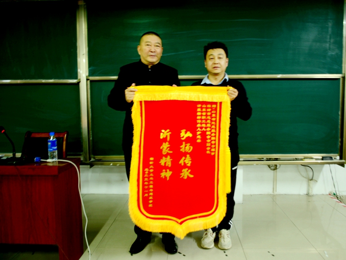 该院共青团委书记王龙简要介绍了尹志林自2021年3月以来自费100余万元追寻先辈足迹、宣扬红色文化、挖掘英烈事迹、传承沂蒙精神的感人经历,对尹志林应邀义务为师生宣讲沂蒙精神表示感谢。并代表学院向尹志林赠送锦旗。