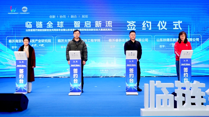 大赛的成功举办也推进了更多优质项目落地临沂。活动现场,来自临沂睿新信息科技有限公司、临沂大学信息学院的2个项目达成合作意向并签约。